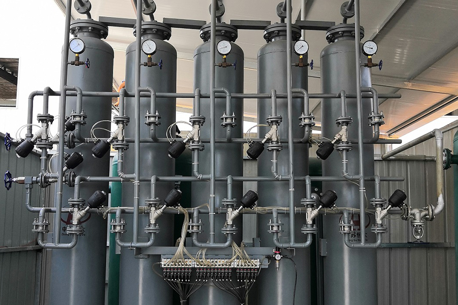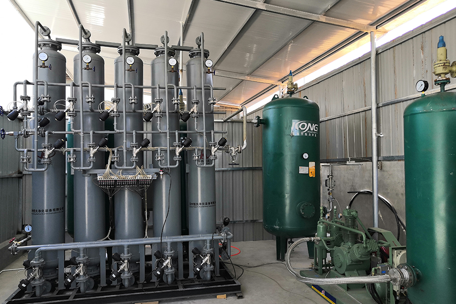 처리되지 않은 가스는 흡착기 세트로 들어가 흡착 및 건조된 후 필터를 통해 사용 지점으로 보내집니다. 미량의 제품 가스를 취하고 250°C-300°C의 온도에서 다른 흡착기 세트에서 흡착된 포화 분자체를 재생합니다. 두 세트의 흡착기 작업과 재생이 교대로 수행됩니다. 지속적이고 안정적인 제품가스를 얻을 수 있습니다.